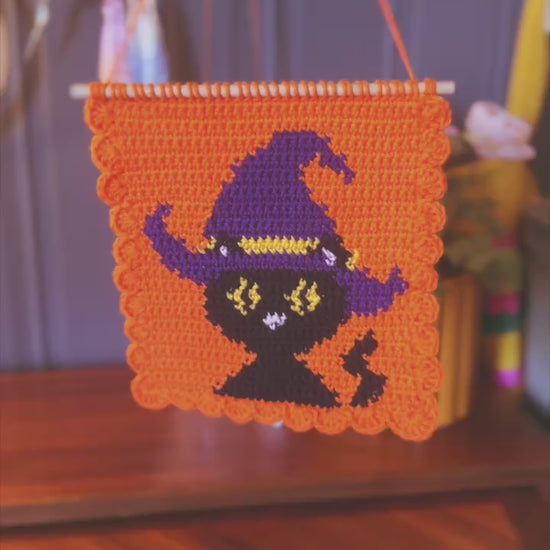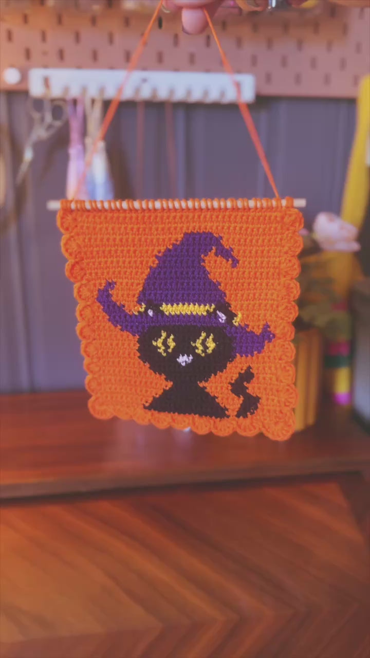 - Witchy Cat Wall Hanging – A mischievous black cat with glowing eyes and a purple hat.