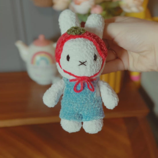 Meet the Tomato Bun — a handmade crocheted bunny charm that’s equal parts adorable and slightly unhinged (in the best way). Dressed in soft blue overalls and rocking a tiny tomato hat, this plush cutie is ready to hop onto your bag, keys, or anywhere that needs a boost of cozy chaos.